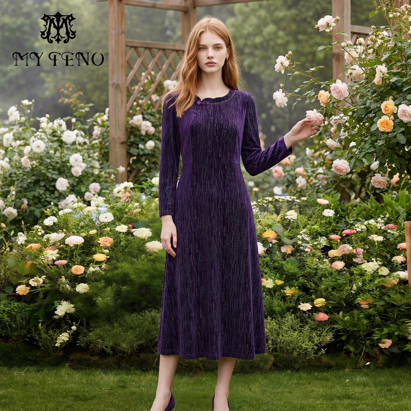 马天奴春秋新款紫色丝绒盘扣连衣裙子圆领收腰复古气质女时尚流行