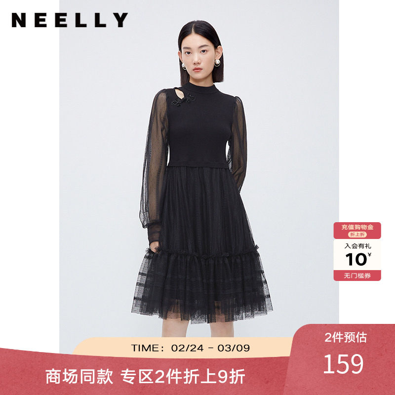 NEELLY纳俪商场同款新中式盘扣连衣裙女黑色中长款针织网纱拼接裙