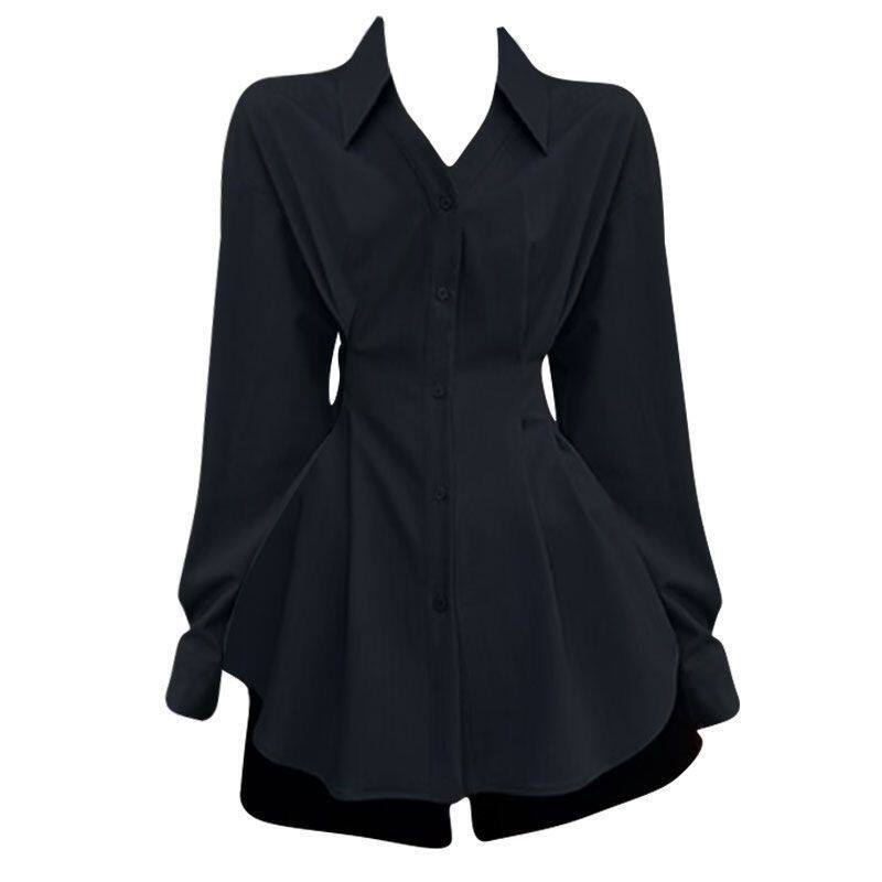 大码春秋法式MM设计独特长袖收腰衬衫新款显瘦别致黑色衬衣上衣