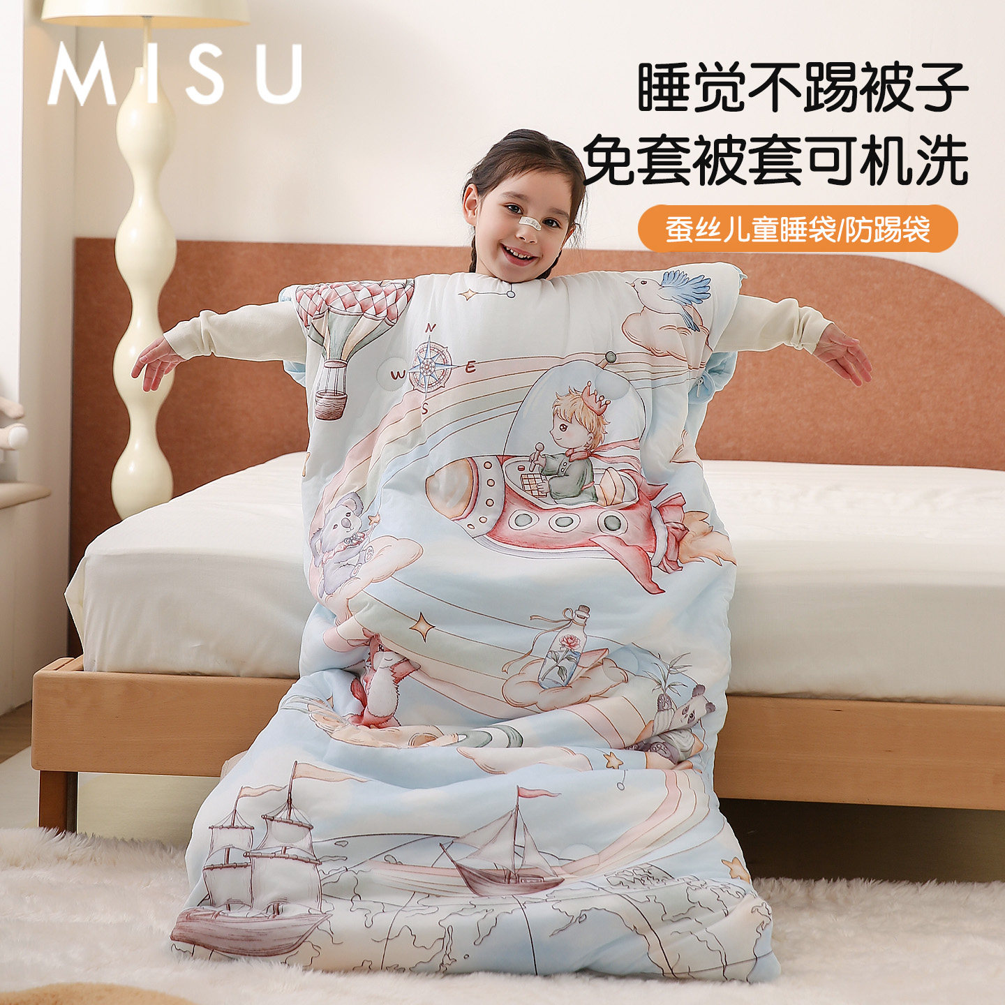 米苏蚕丝加厚儿童睡袋宝宝卡通防踢被婴儿被子大童针织背心秋冬季