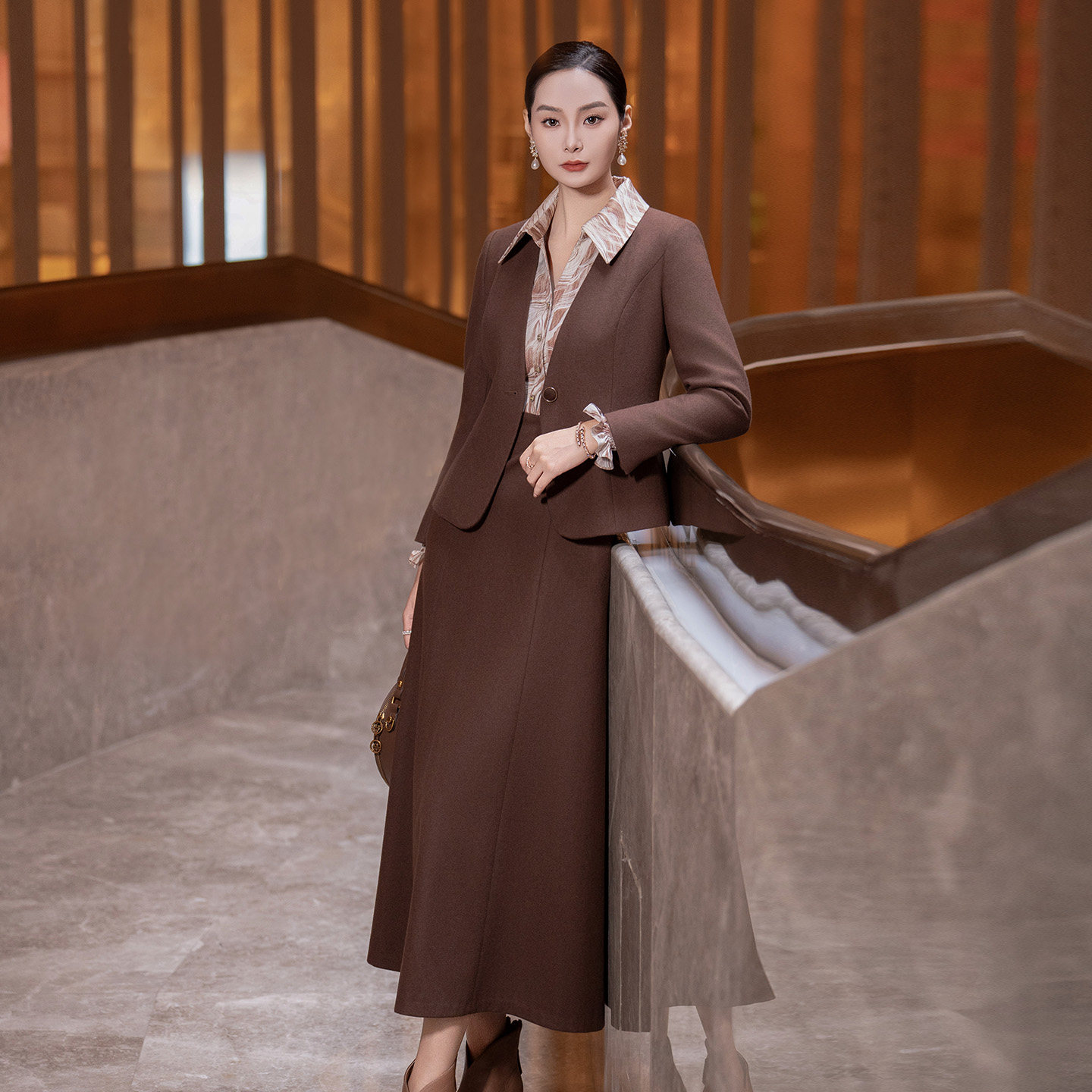 咖色时尚毛呢套装裙女2025冬季新款职业西装两件套气质羊毛连衣裙