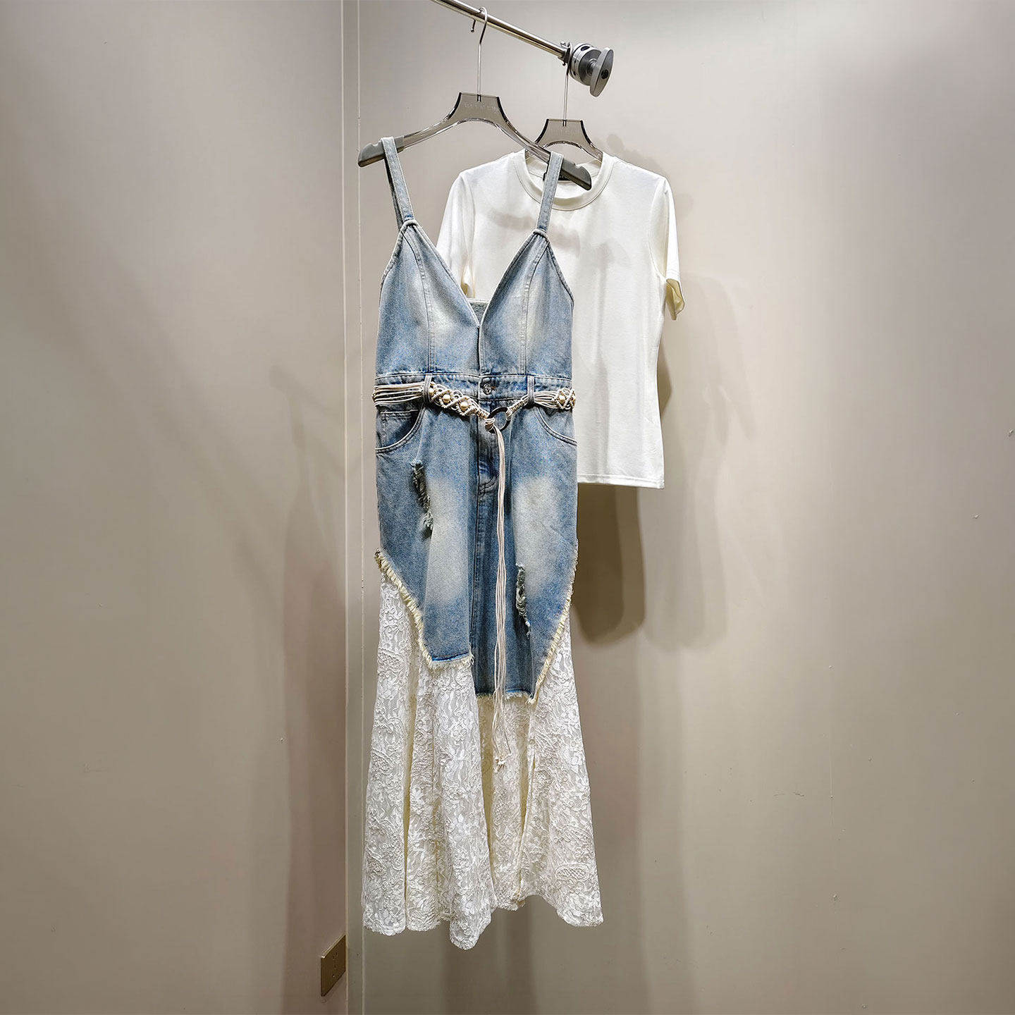 NKC.欧洲站小众HELMCH南油高端法式浪漫T恤不规则牛仔吊带裙套装