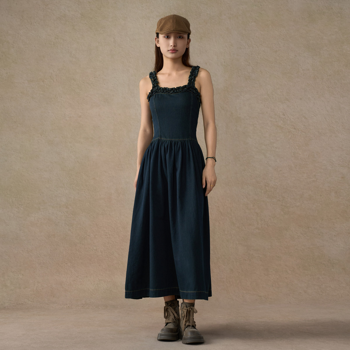 ONLY2025冬新款甜美荷叶边牛仔吊带裙中长款连衣裙女|125342010
