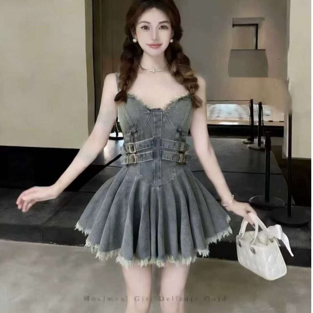 甜辣妹复古牛仔吊带裙女2026春夏季新款设计感流苏收腰显瘦连衣裙