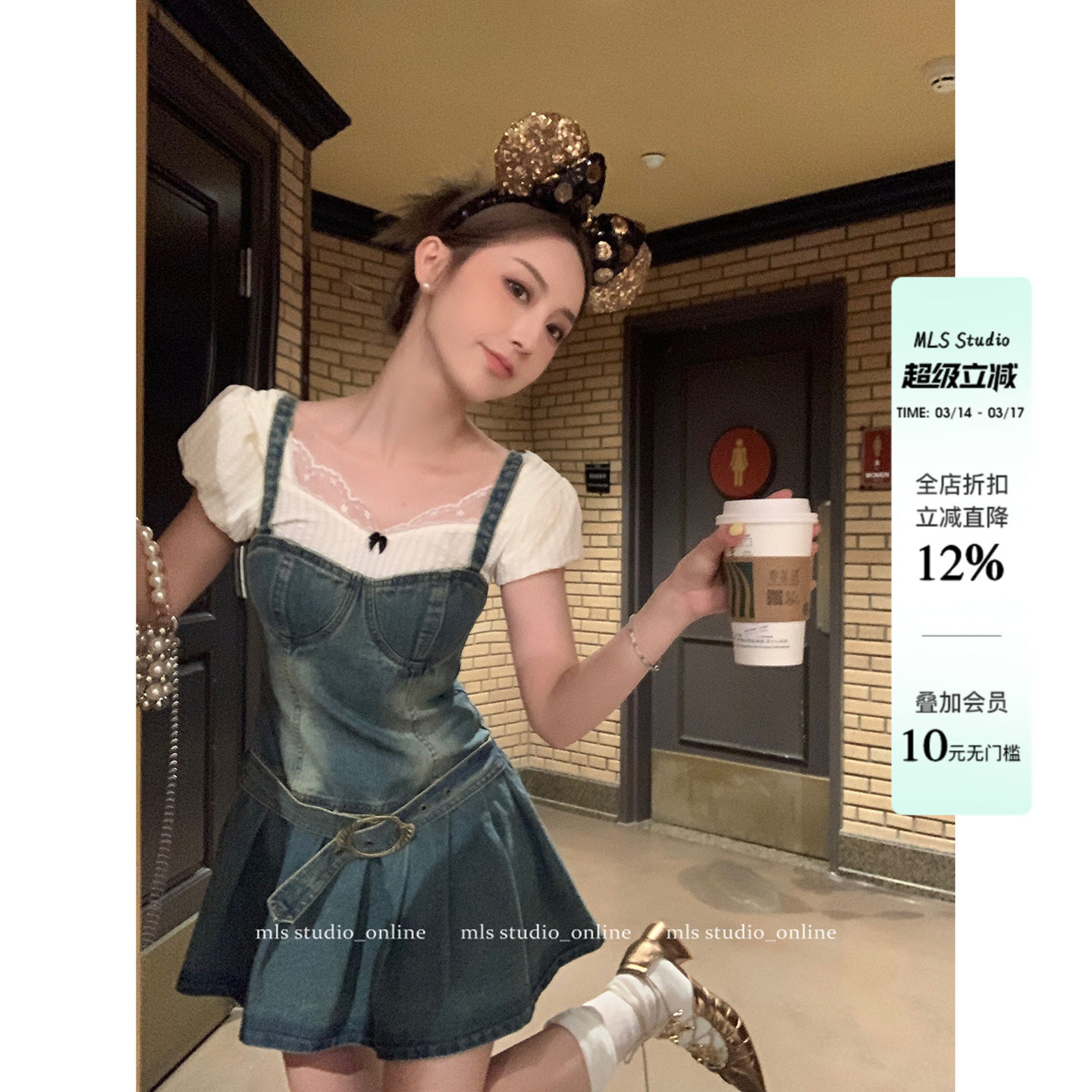 迟伞伞 26/ss 丹宁少女 蝴蝶结系带波点棉质牛仔吊带裙时髦短裙春