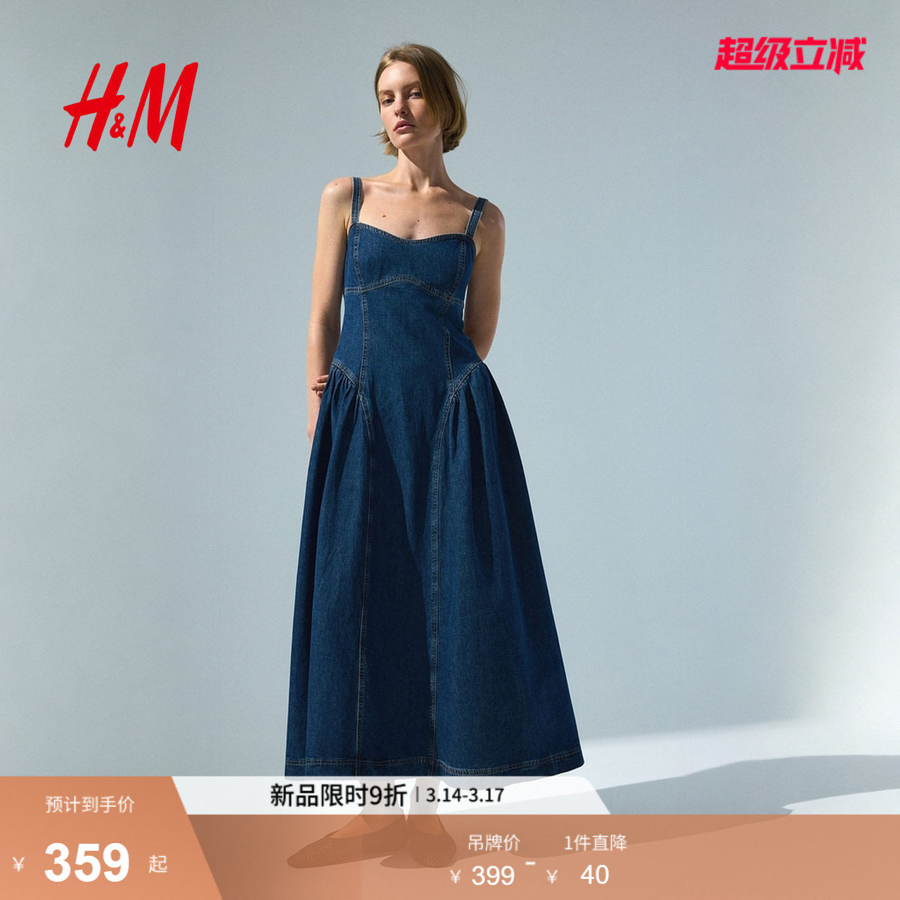 HM女装连衣裙2026春季新款度假风休闲喇叭裙摆牛仔吊带裙1328040