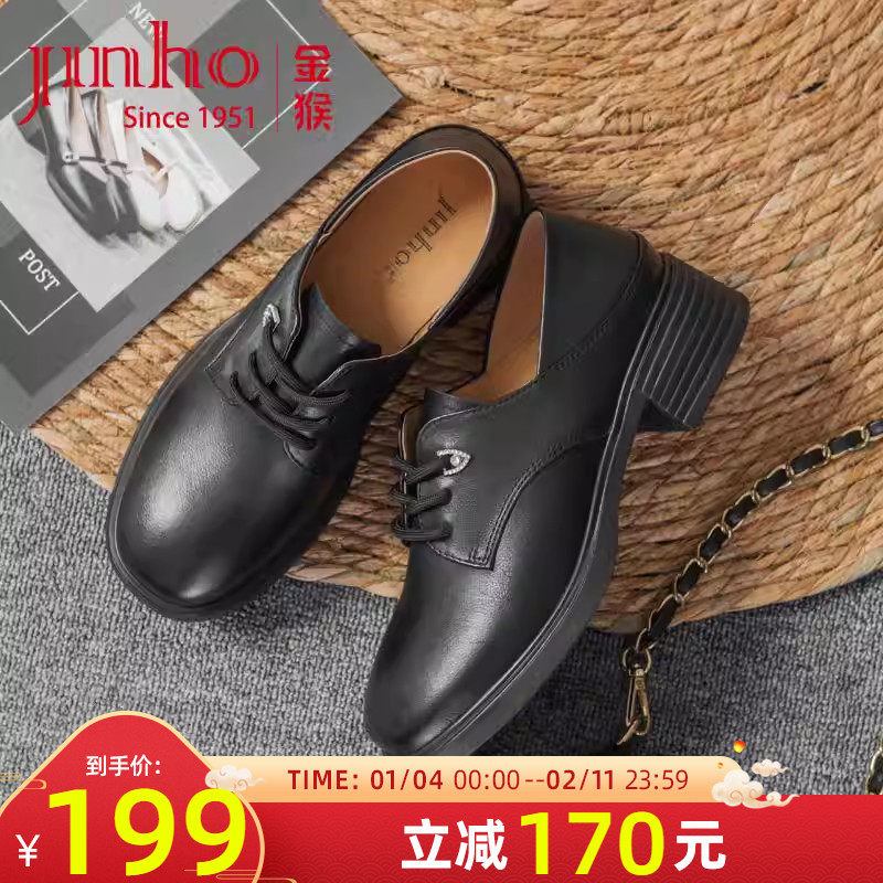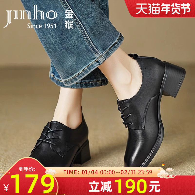 金猴女鞋2025春秋季新款系带牛皮粗跟高跟英伦风单鞋真皮工作女鞋