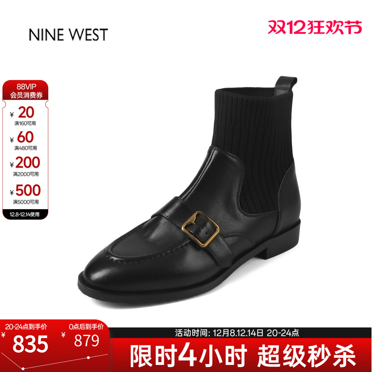 奥莱专供Nine West/玖熙针织拼接皮鞋复古短靴女法式瘦瘦靴马丁靴