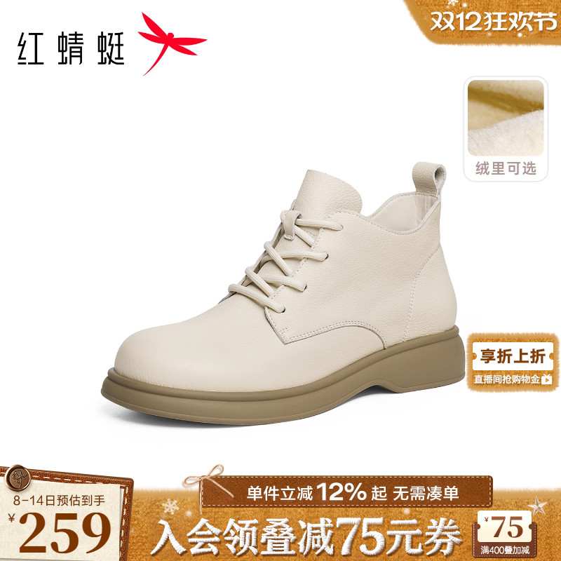 红蜻蜓马丁靴2025秋冬新款女鞋真皮加绒妈妈靴白色短靴巨好看靴子