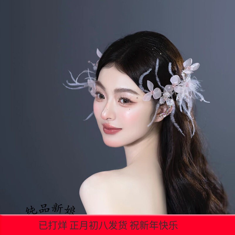 新娘头饰高级感粉色羽毛发夹侧边夹套装婚纱礼服写真盘发饰品发饰