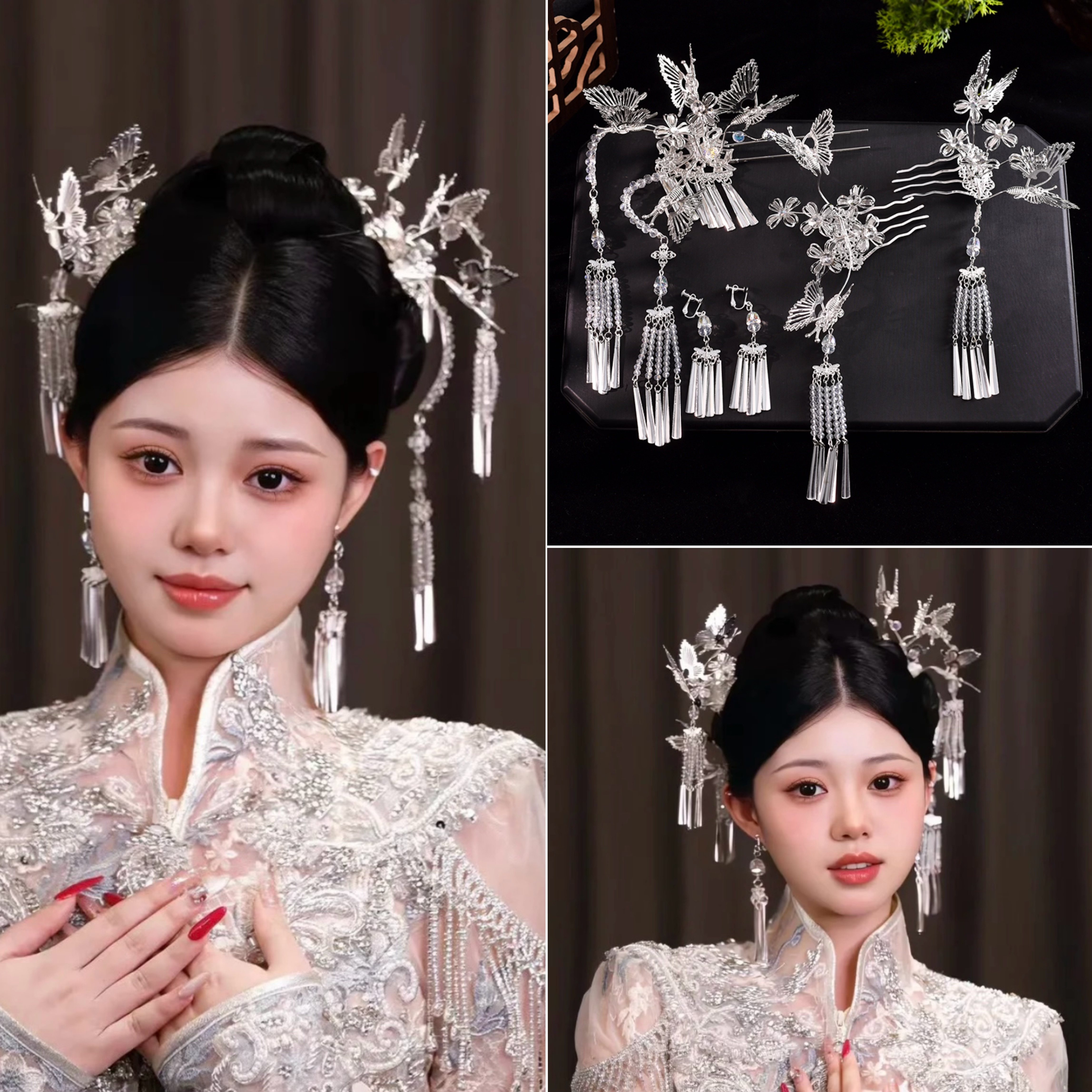 新娘头饰银色金属蝴蝶新中式秀禾配饰龙凤冠古装精致汉服盘发饰品