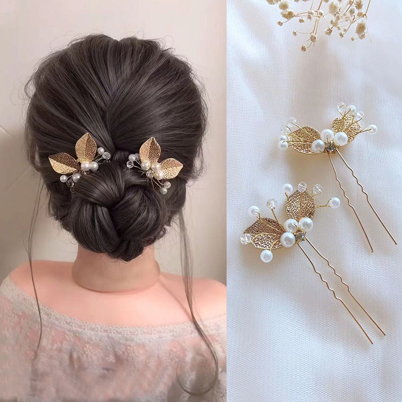 气金叶子珍珠水晶发叉质优惠盘发饰品简单大方u型夹发卡子女头饰