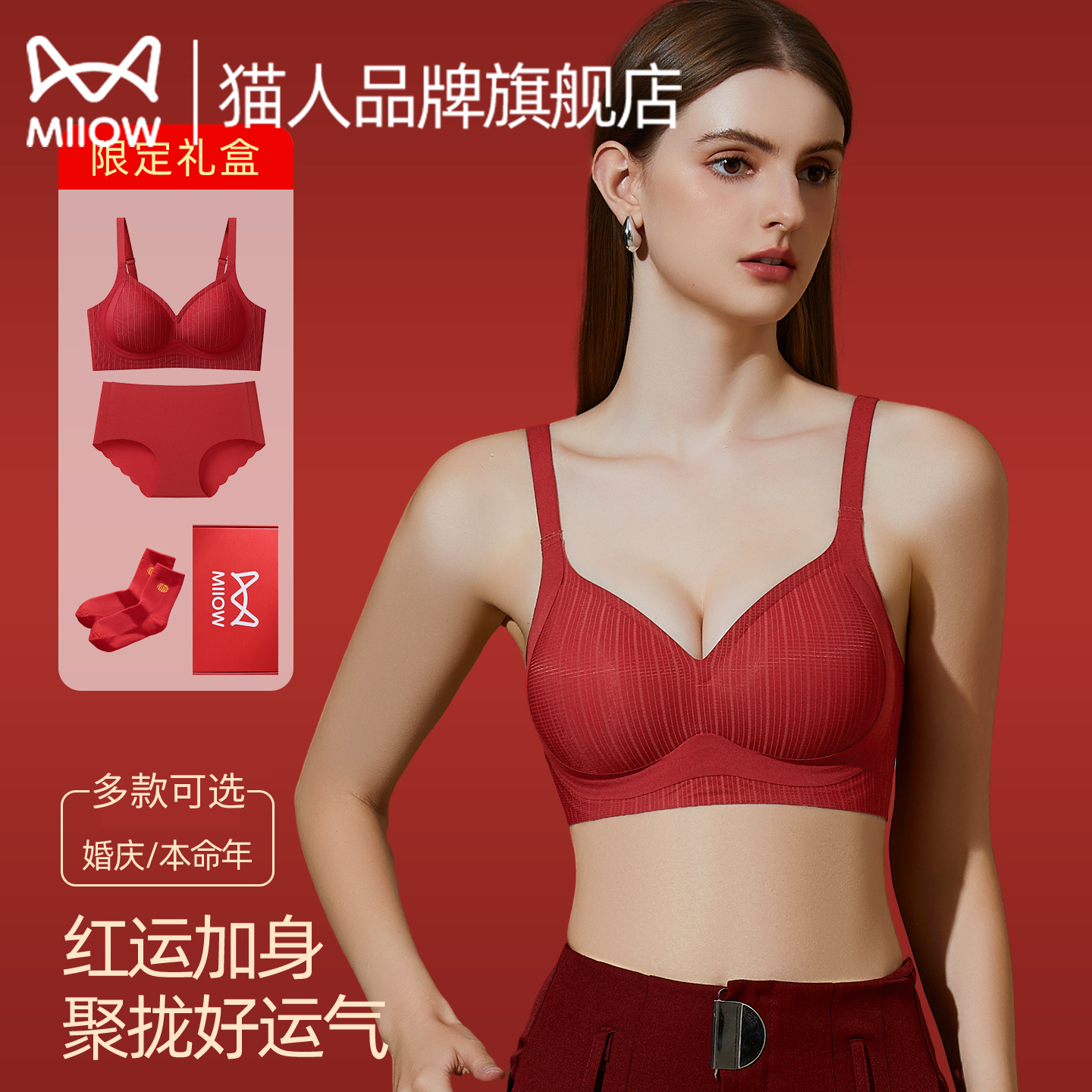 猫人红色内衣女聚拢小胸2025新款本命年新娘婚嫁鸿运内裤文胸套装