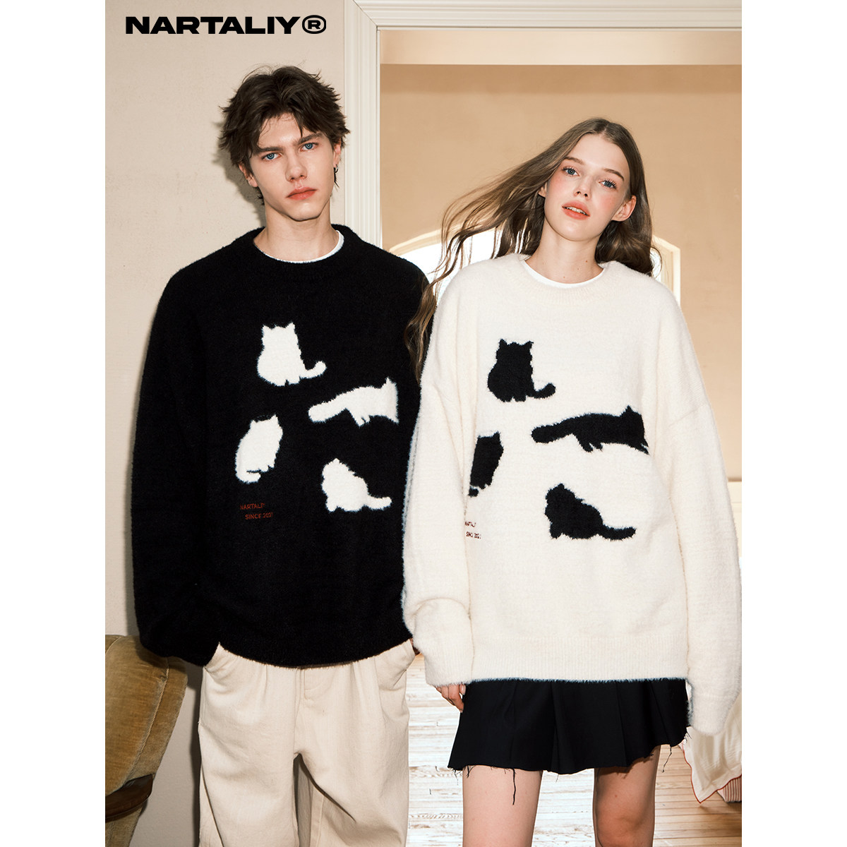 NARTALIY猫咪剪影毛衣男女情侣秋冬潮美式复古宽松慵懒软糯针织衫