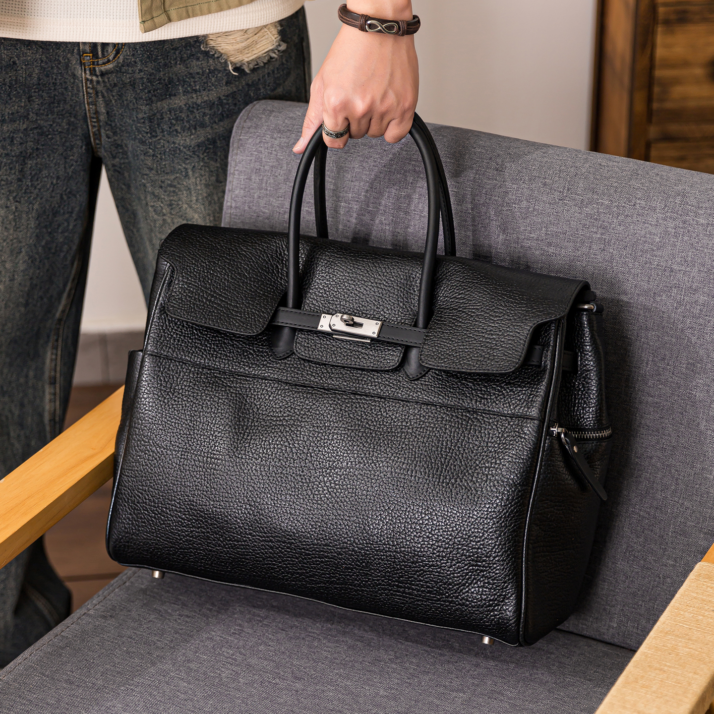 后步男士轻奢真皮铂金包手提包行李袋大容量牛皮短途旅行包斜挎包