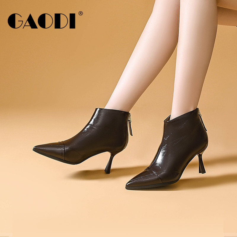 高蒂时装靴女瘦瘦靴2025冬季气质真皮尖头复古加绒英伦短靴高跟鞋