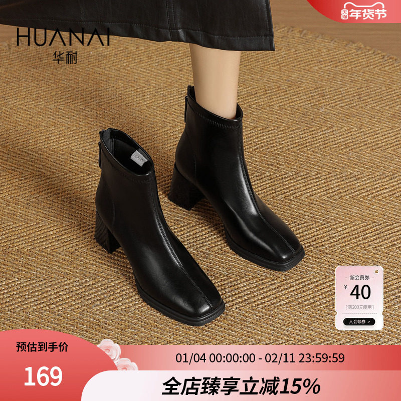 华耐方头高跟短靴女2025秋冬新款通勤英伦风瘦瘦靴气质百搭时装靴