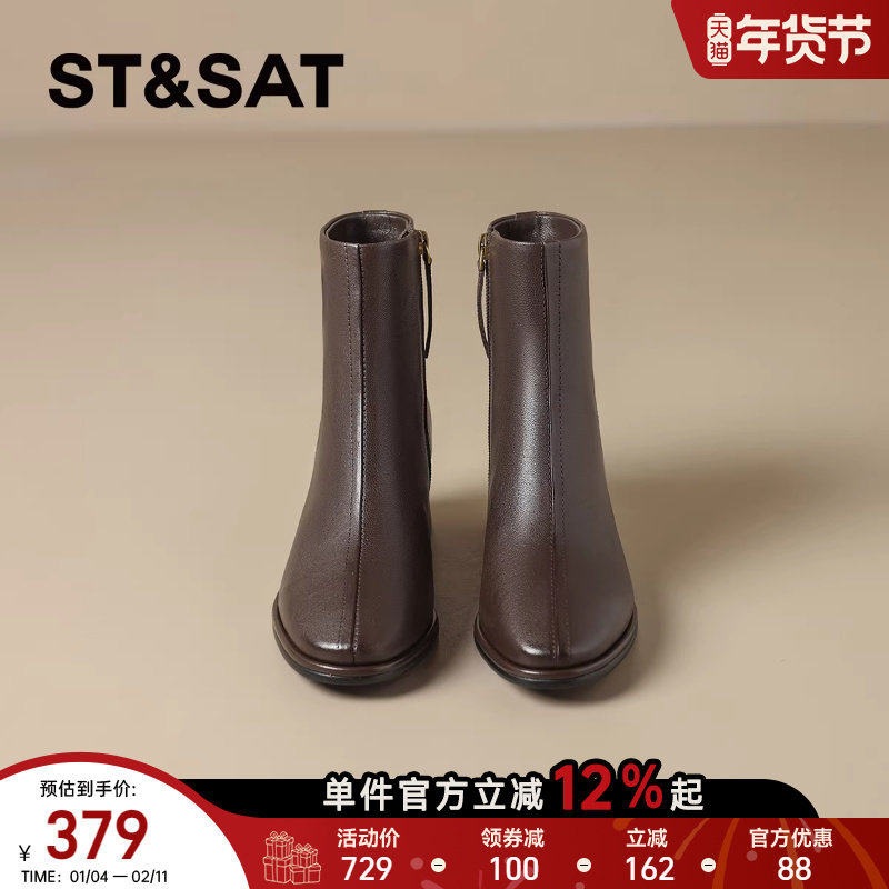千百度时尚高跟羊皮靴百搭气质秋冬粗跟时装靴方头英伦风短靴女鞋