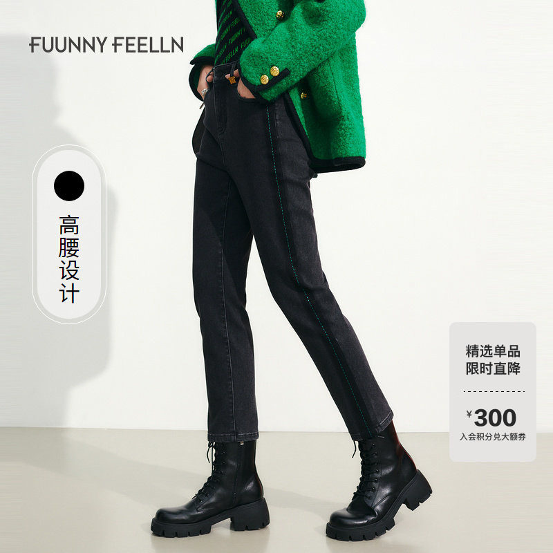 【舒心】歌莉娅黑色抓绒牛仔裤女秋冬高腰紧身小脚裤靴裤显瘦长裤