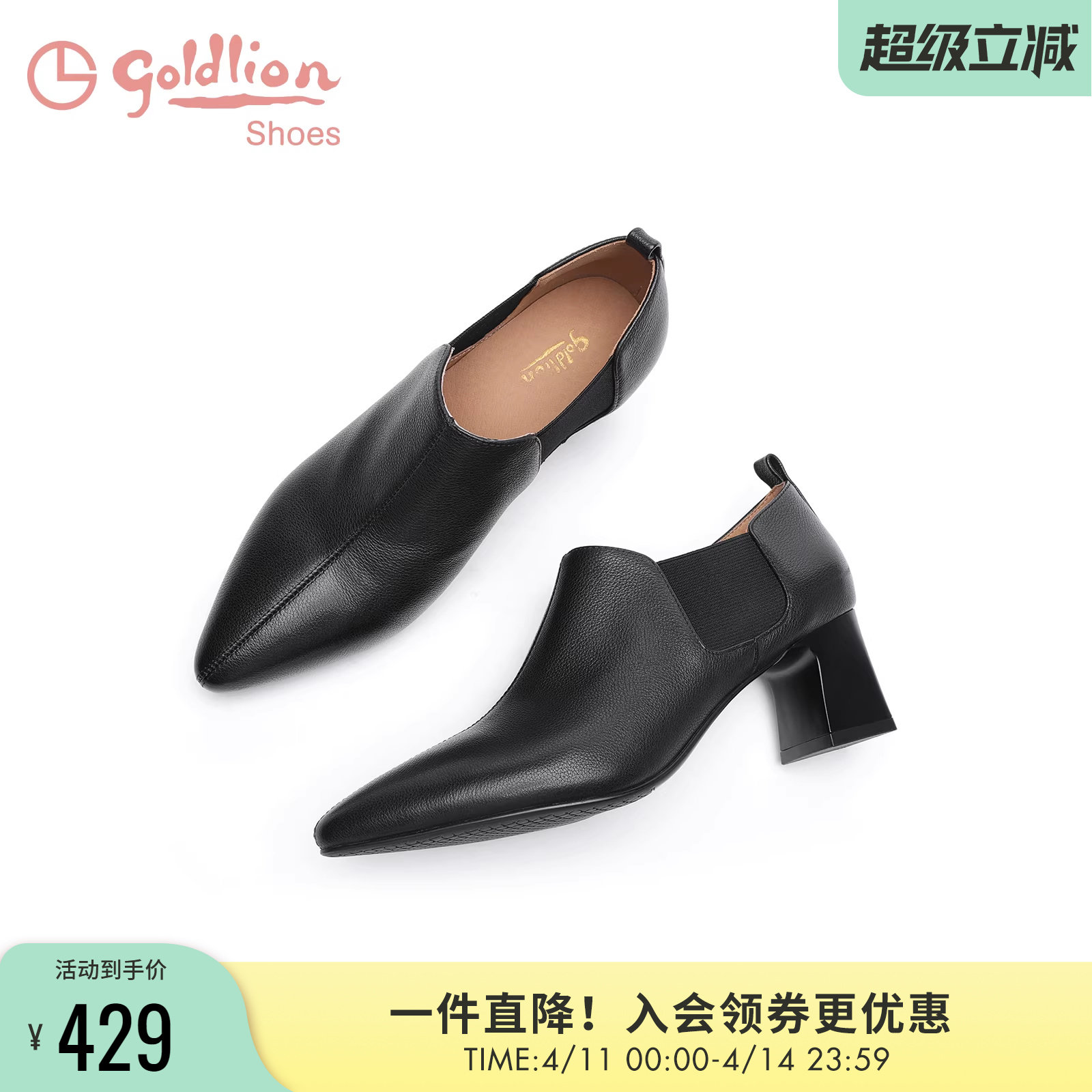 金利来女鞋春秋新款黑色牛皮中跟裸靴百搭通勤尖头粗跟深口单鞋女