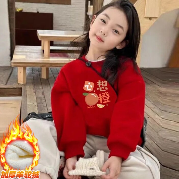 儿童大红色卫衣冬季加绒新年卫衣加厚款男女童过年喜庆拜年服上衣