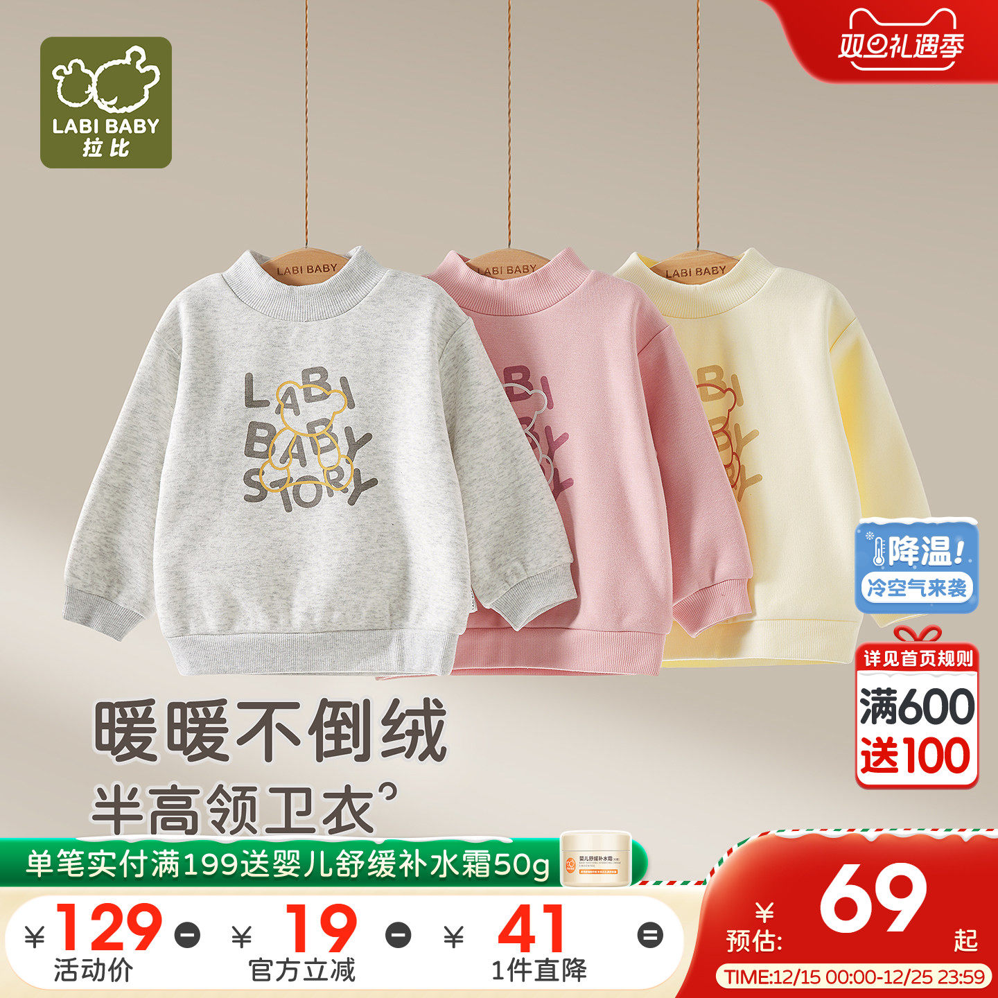 拉比儿童不倒绒半高领衣加绒加厚25秋冬新款宝宝长袖保暖套头卫衣