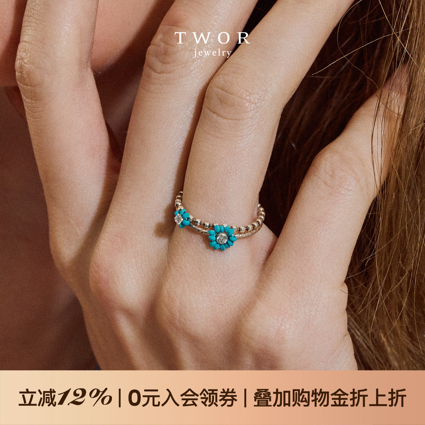 TWOR缇坞/S925银迷你绿松石钻花套戒手工叠戴戒指复古食指指环女