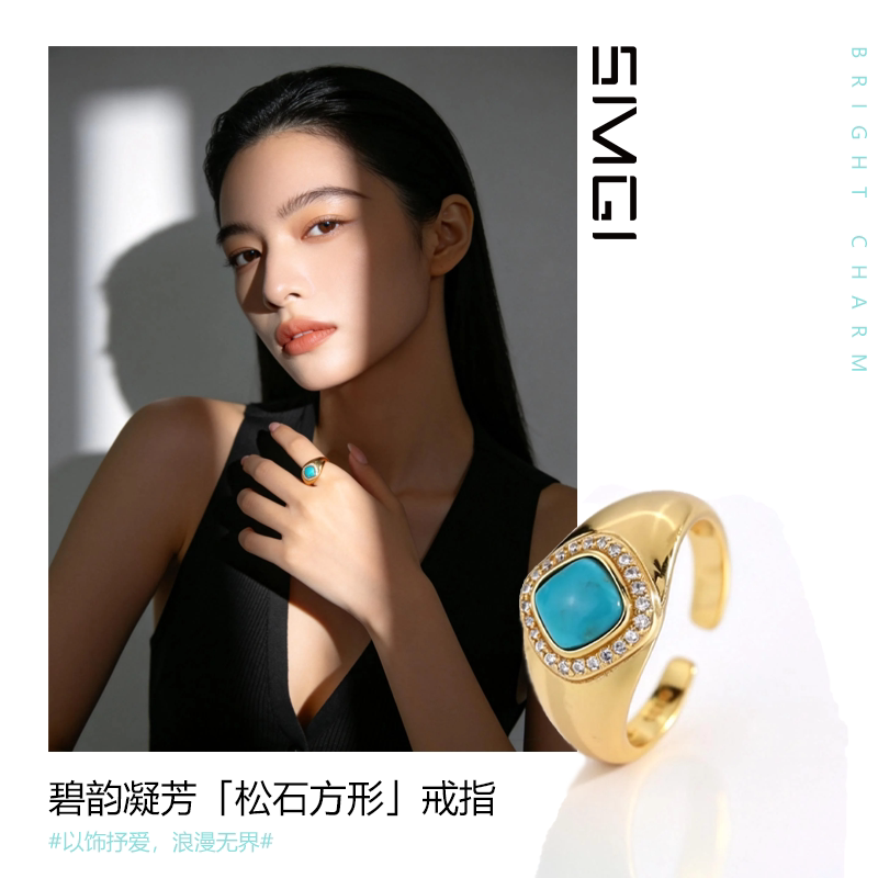 SMGI/绿松石戒指纯银镀18k金天然松石方形古典微镶开口可调节指环