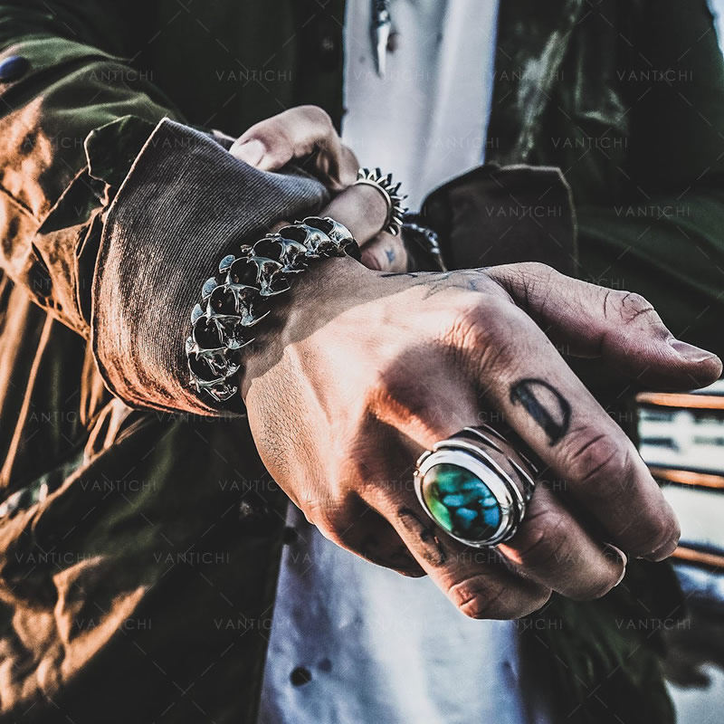 VANTICHI原创三角纹绿松石纯银戒指男 复古摇滚文艺青年泰银指环