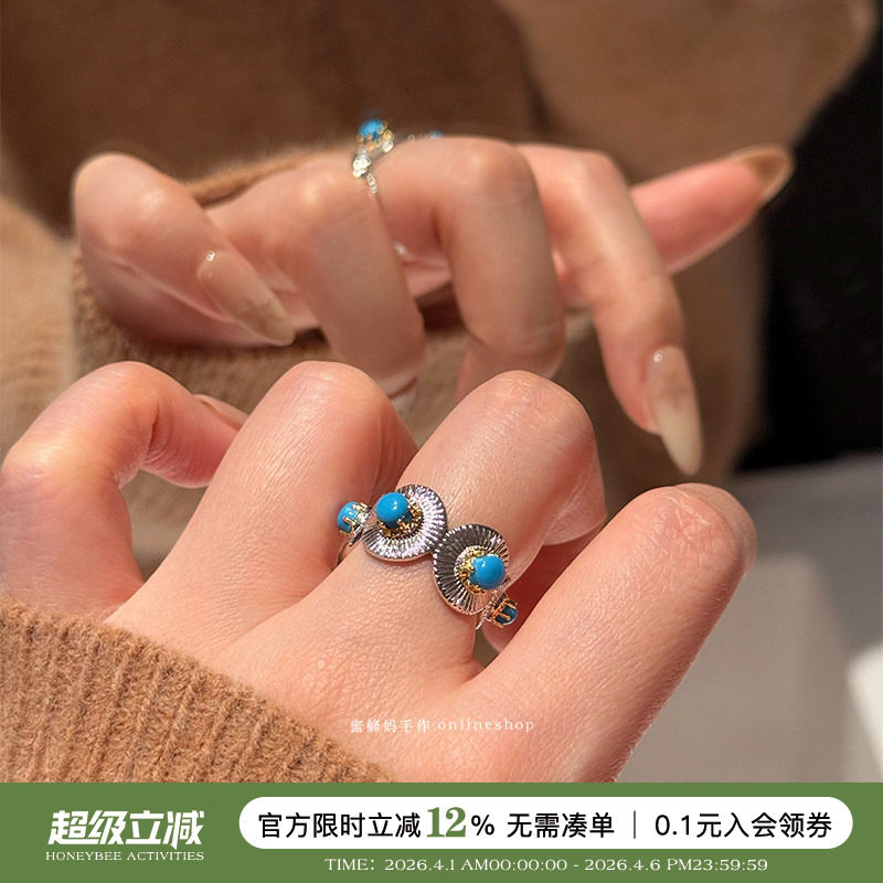 蜜蜂妈手作 小众设计小雏菊绿松石拉丝戒指女高级感开口调节指环