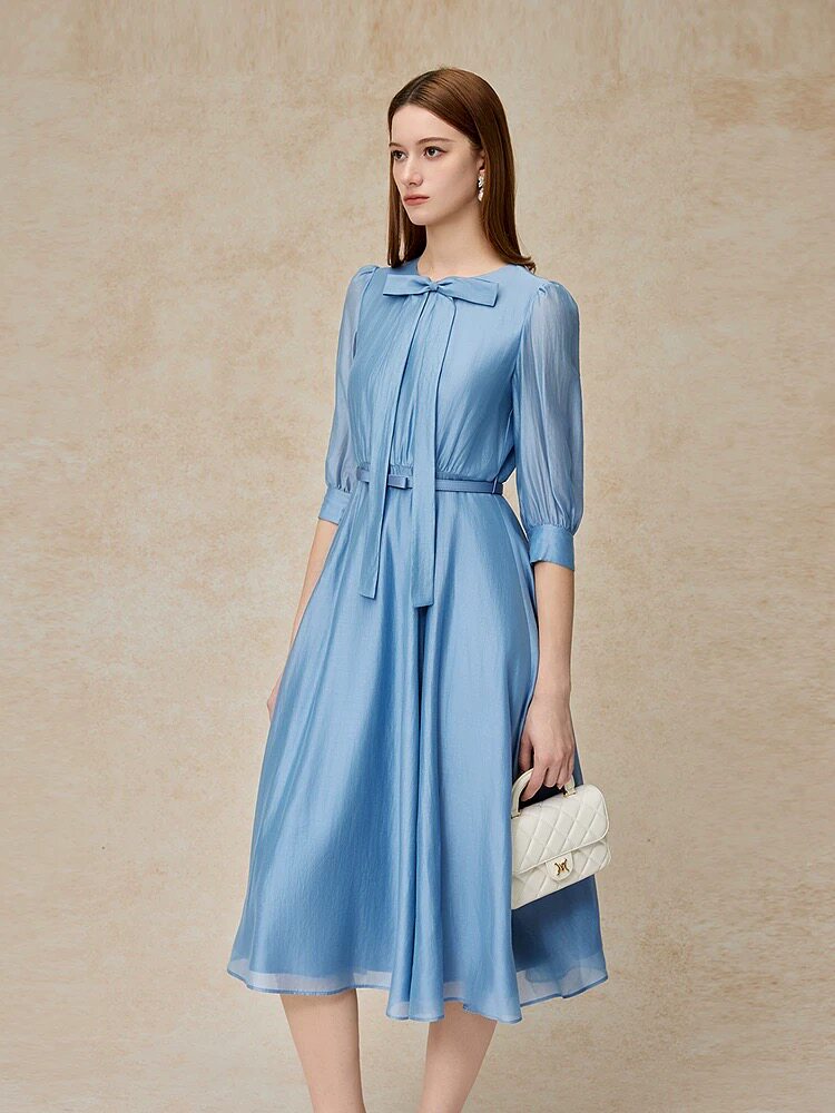 莫佐MOJO新品2026浪漫优雅连衣裙蝴蝶结领收腰中长度假裙雾霾蓝