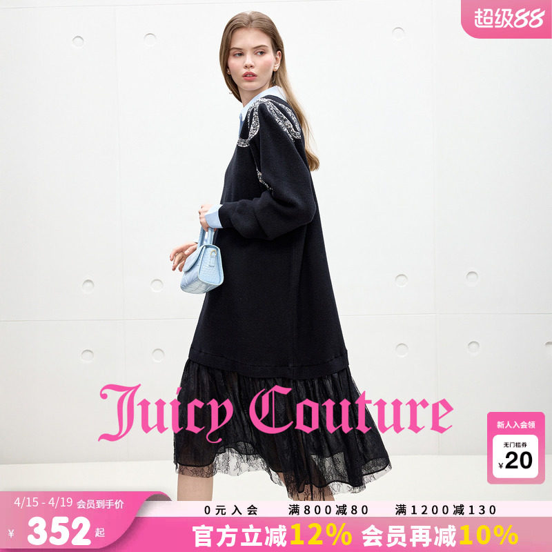 Juicy Couture橘滋连衣裙女蝴蝶结缀饰黑色针织蕾丝拼接中长裙