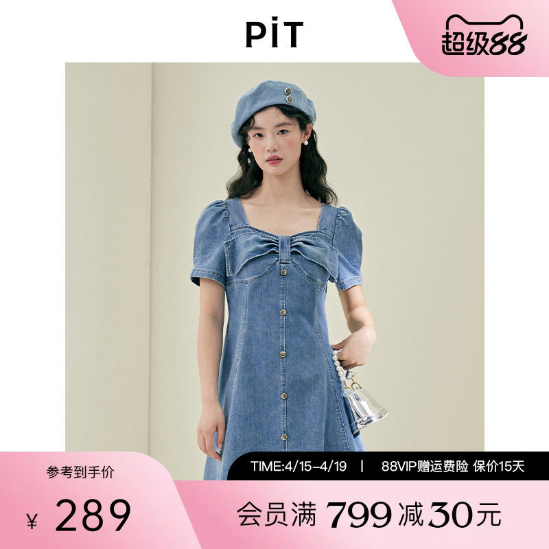 PIT复古方领蝴蝶结A字短袖连衣裙女2025夏薄款显瘦直筒伞裙中长裙