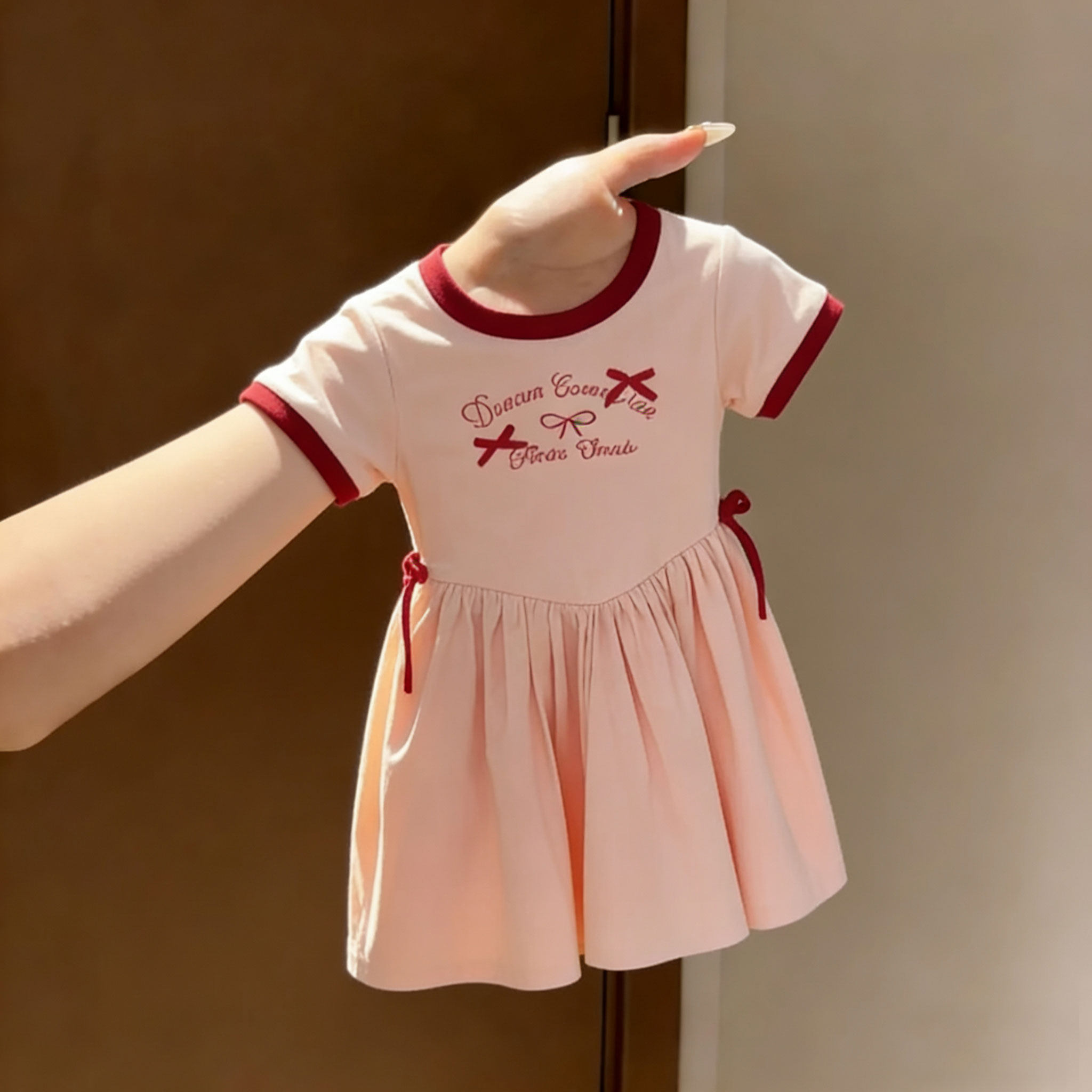 女童纯棉甜美短袖连衣裙夏季新款圆领蝴蝶结字母印花洋气中长裙子