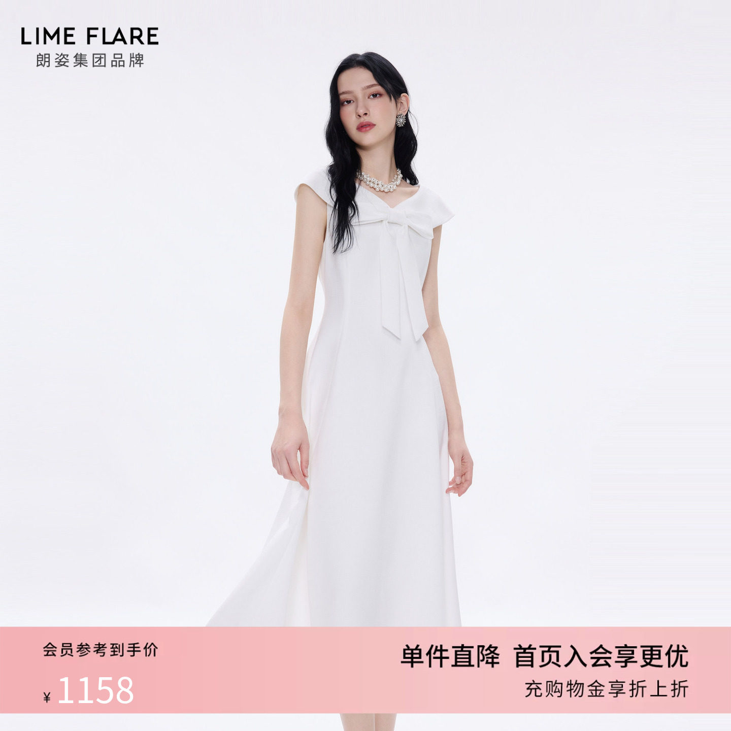 Pomelo 法式气质白色连衣裙蝴蝶结肩带宽松显瘦通勤中长款连衣裙