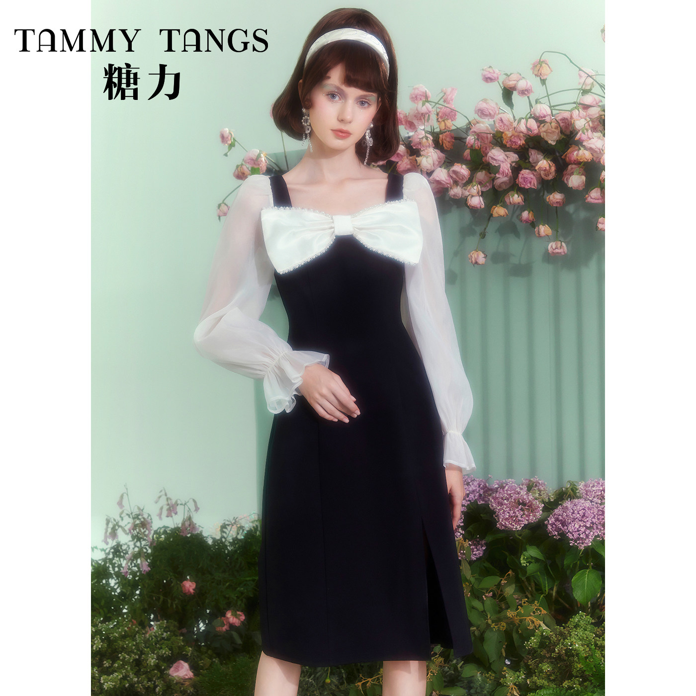 【商场同款】糖力薄纱长袖复古甜美蝴蝶结显瘦中长款开叉连衣裙女