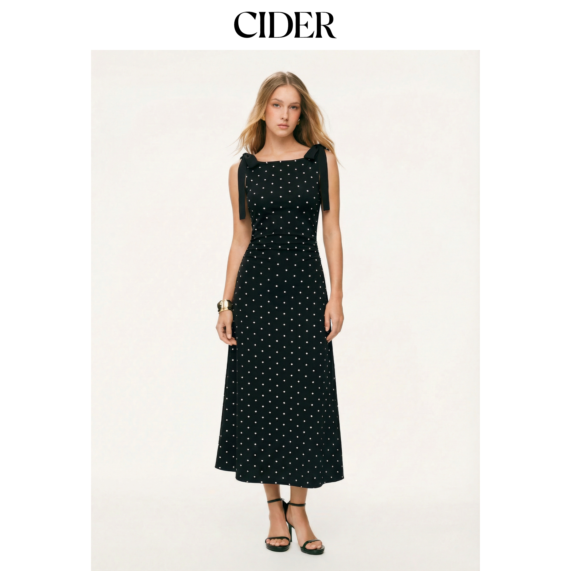 CIDER秋冬女装针织V领波点蝴蝶结中长连衣裙104114395