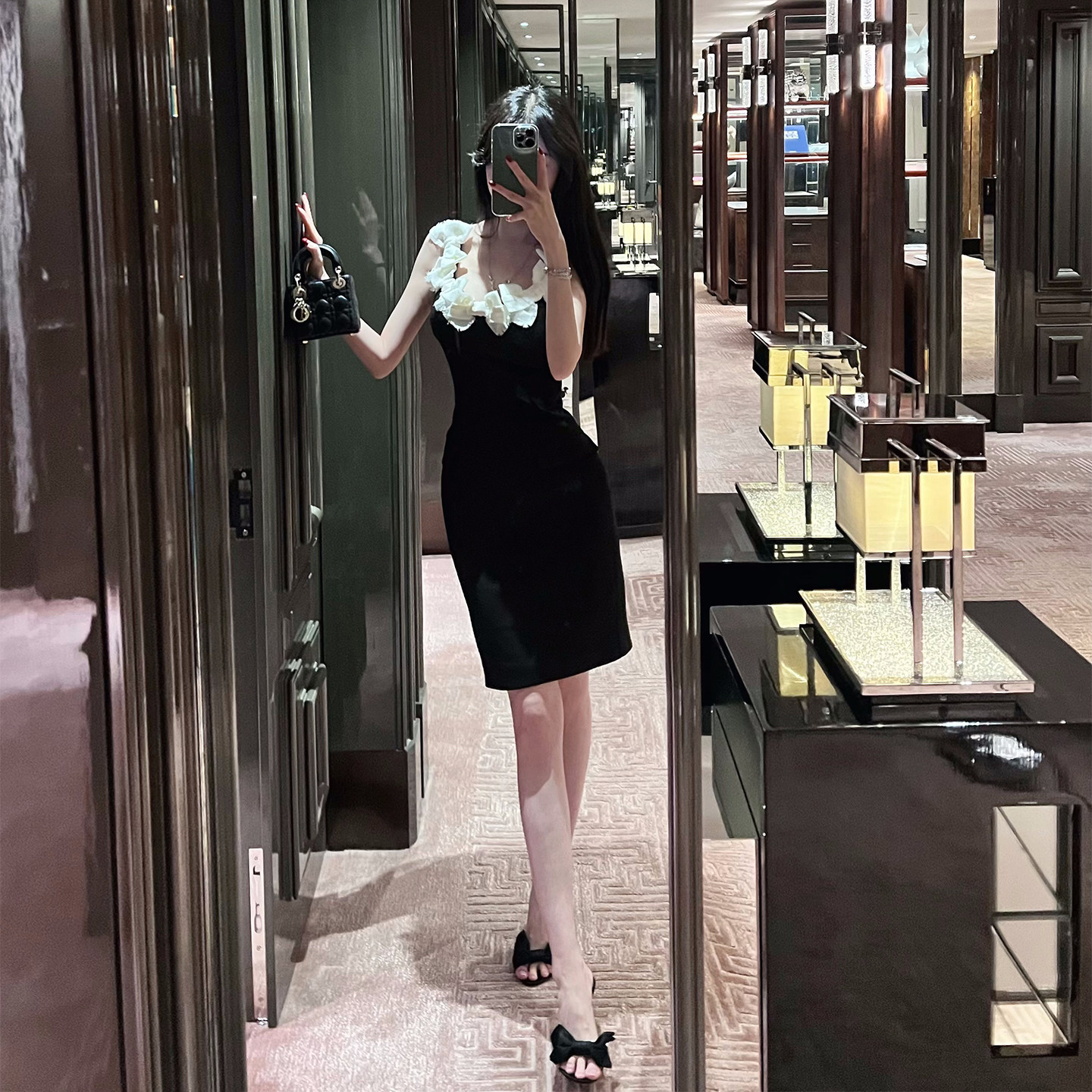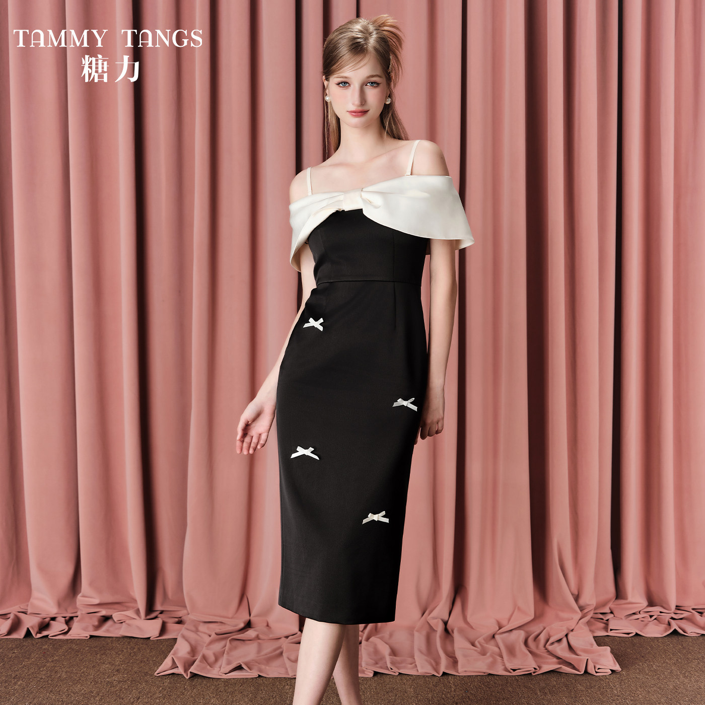 商场同款糖力 轻礼服裙 拼色蝴蝶结可拆吊带一字肩连衣裙女中长款