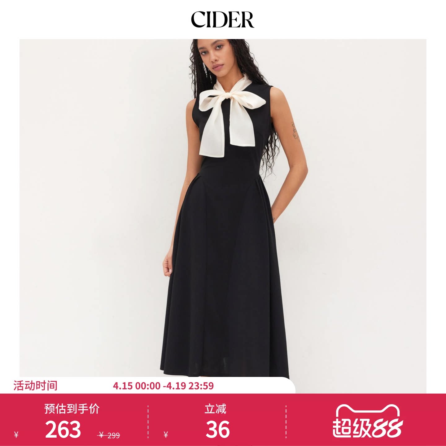 CIDER夏季新品女装双色蝴蝶结褶边中长连衣裙114303602