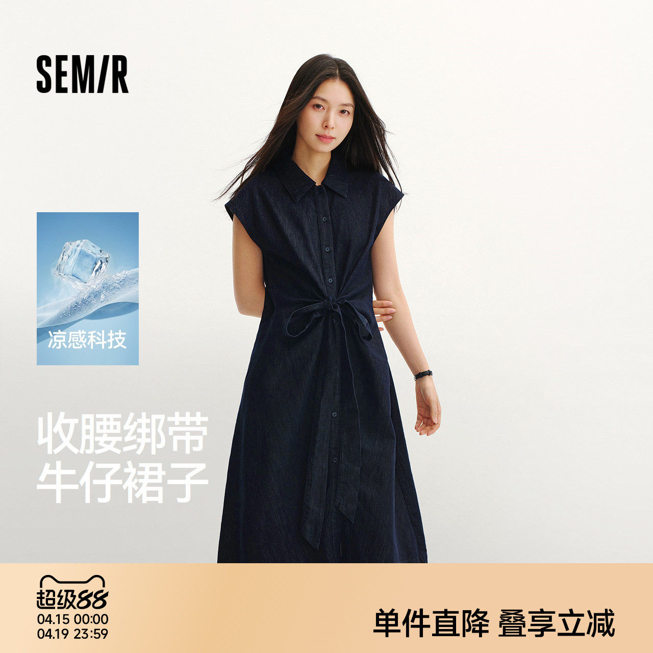 森马牛仔连衣裙女夏扭结收腰蝴蝶结凉感2026新款甜酷设计感中长裙