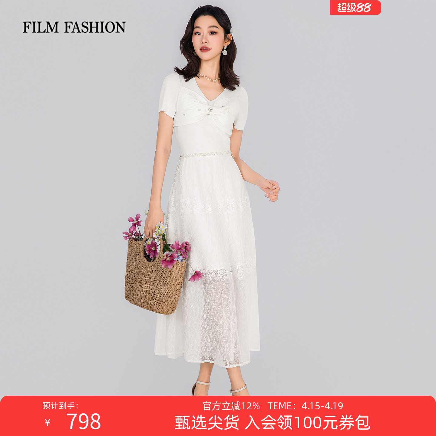 一电影一时装2026夏季新款钉珠短袖连衣裙中长款蝴蝶结收腰女士