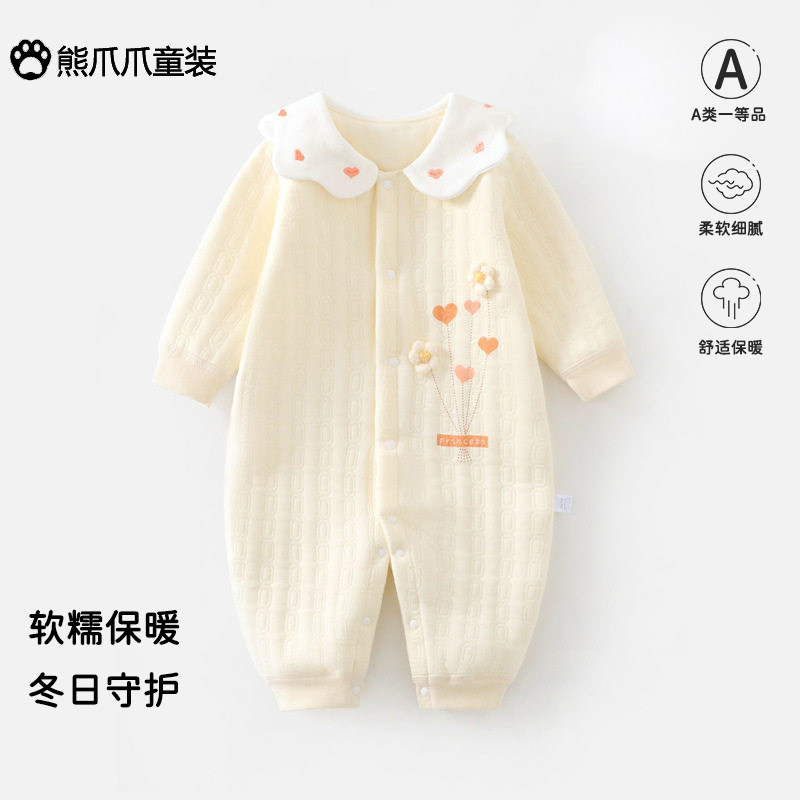 婴儿秋冬款夹棉连体衣女宝宝A类纯棉哈衣三层保暖爬服女童外出服