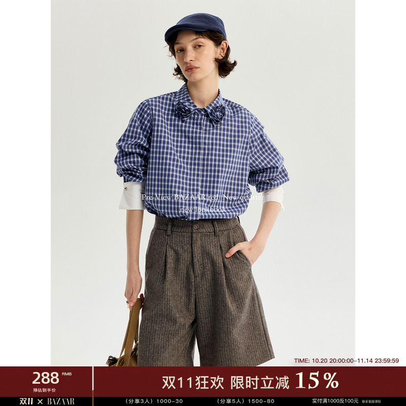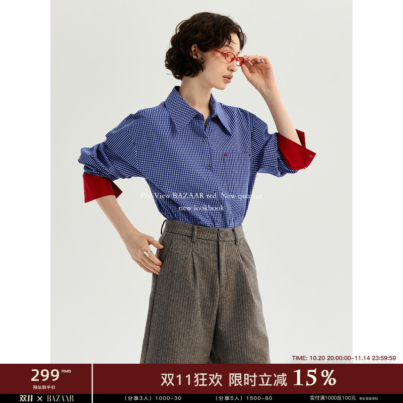 BAZAAR RED芭莎红 设计感玫瑰领口高级简约格纹撞色长袖衬衫女