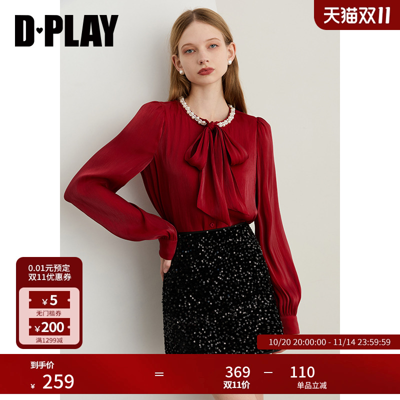DPLAY【珠光星辰系列】2025年秋季新款红色衬衫女珍珠蝴蝶结上衣