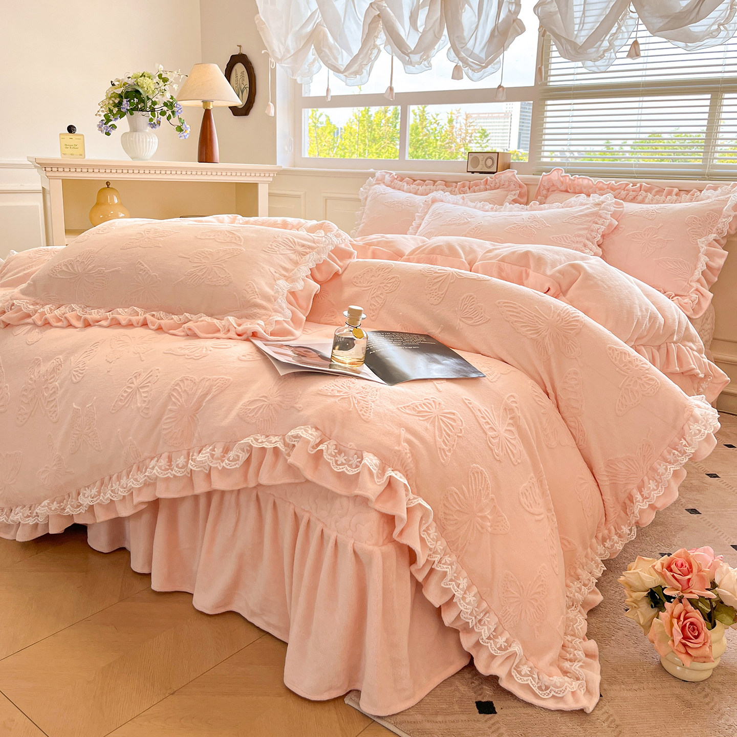 秋冬法式浪漫粉花边公主风牛奶绒四件套雕花绒被套珊瑚绒床单床笠