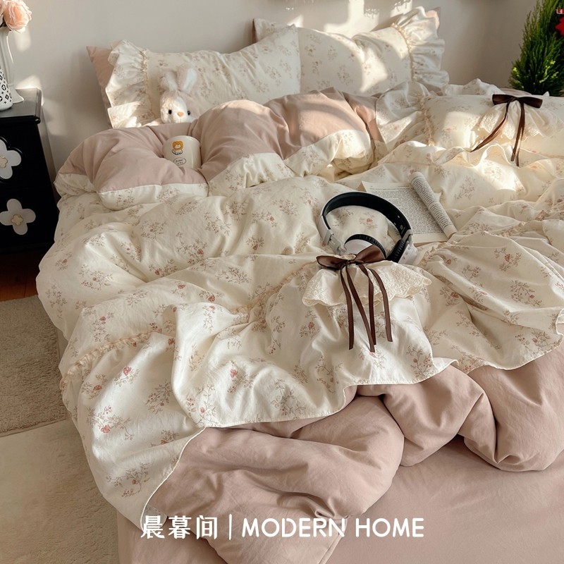 法式轻奢奶油风全棉水洗棉四件套蕾丝公主风少女纯棉被套床单床笠