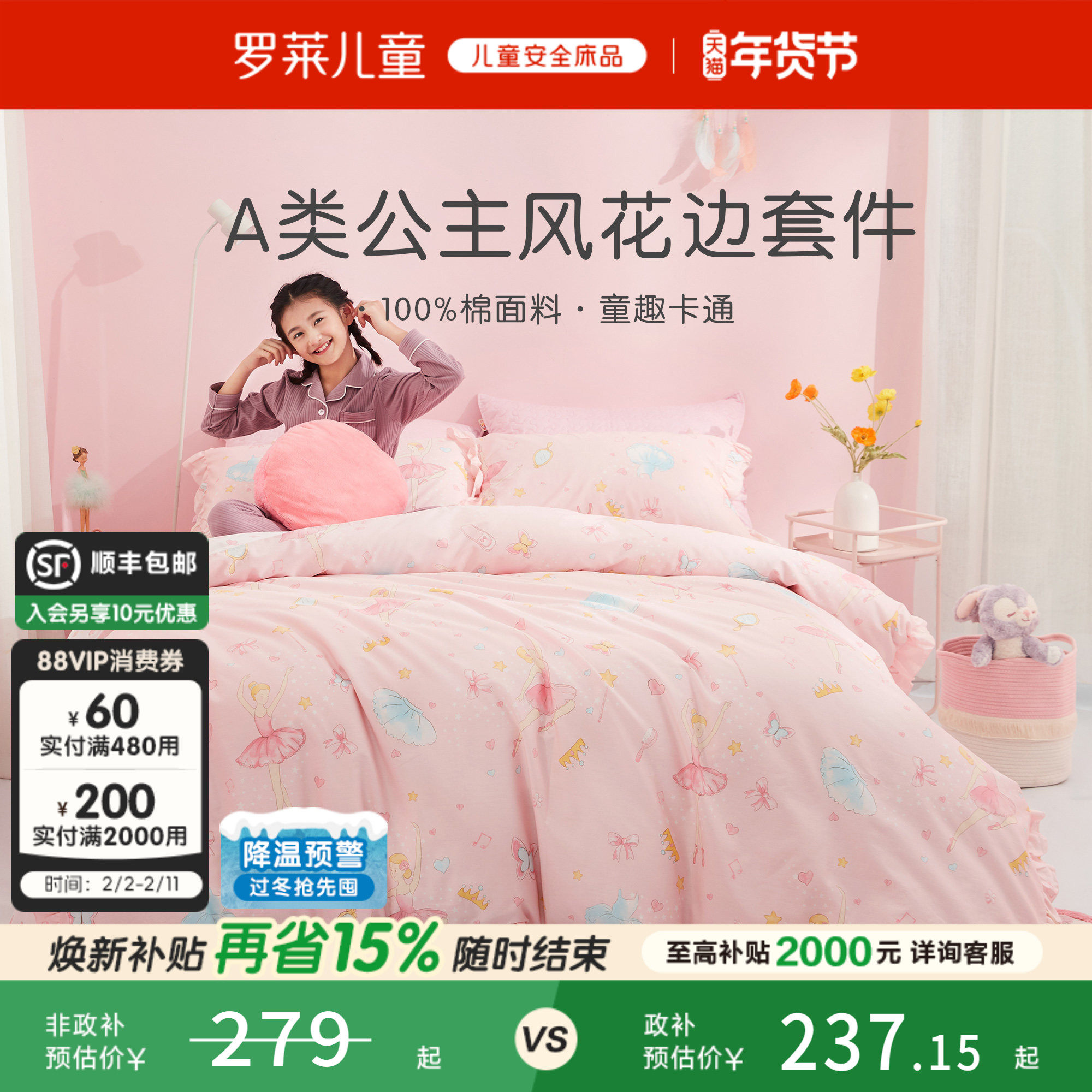 罗莱儿童100棉公主风三件套花边款被套床单床笠学生床上四件套女