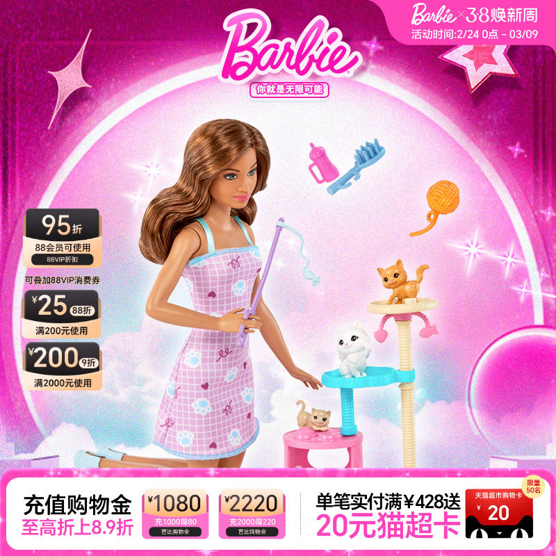 Barbie芭比娃娃之逗猫礼盒套装女孩生日礼物过家家儿童益智玩具