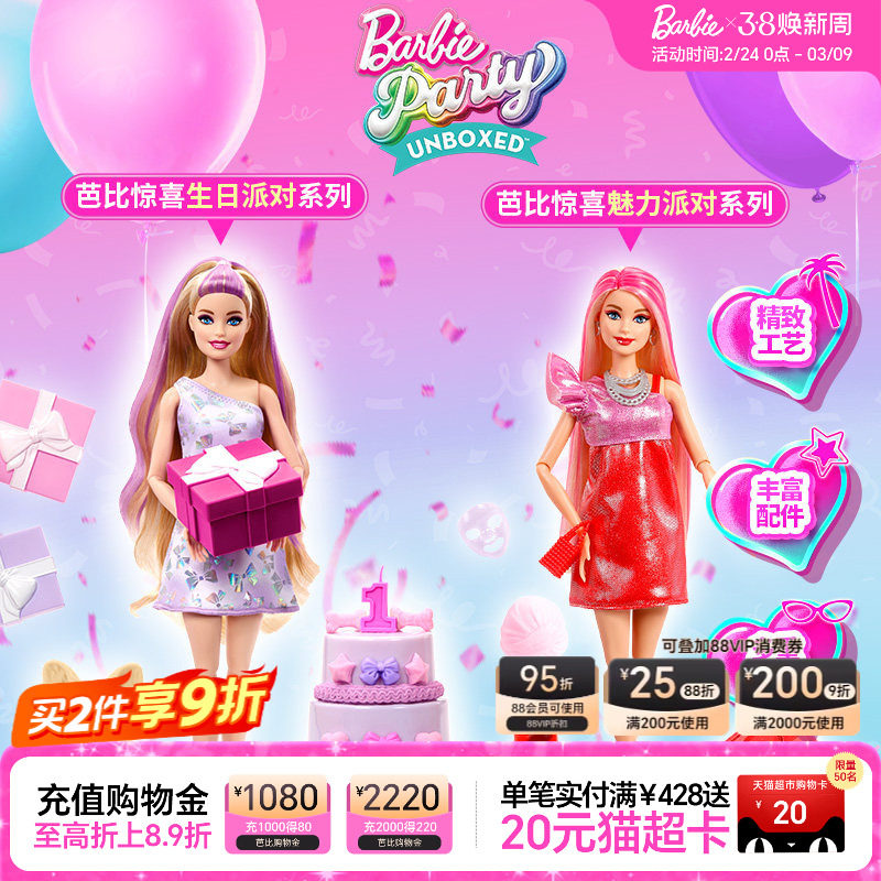 芭比娃娃Barbie惊喜生日魅力派对套装女孩玩具过家家生日礼物送礼