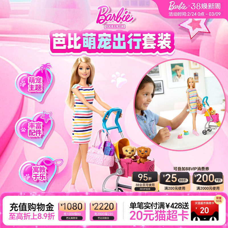 【新品】芭比娃娃Barbie芭比萌宠出行套装过家家玩具女孩生日礼物